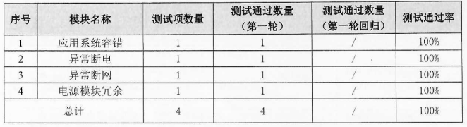 可靠性方面:测试范围包括应用系统容错、异常断电、异常断网、电源模块冗余共4个模块,执行四条用例,全部顺利获得。